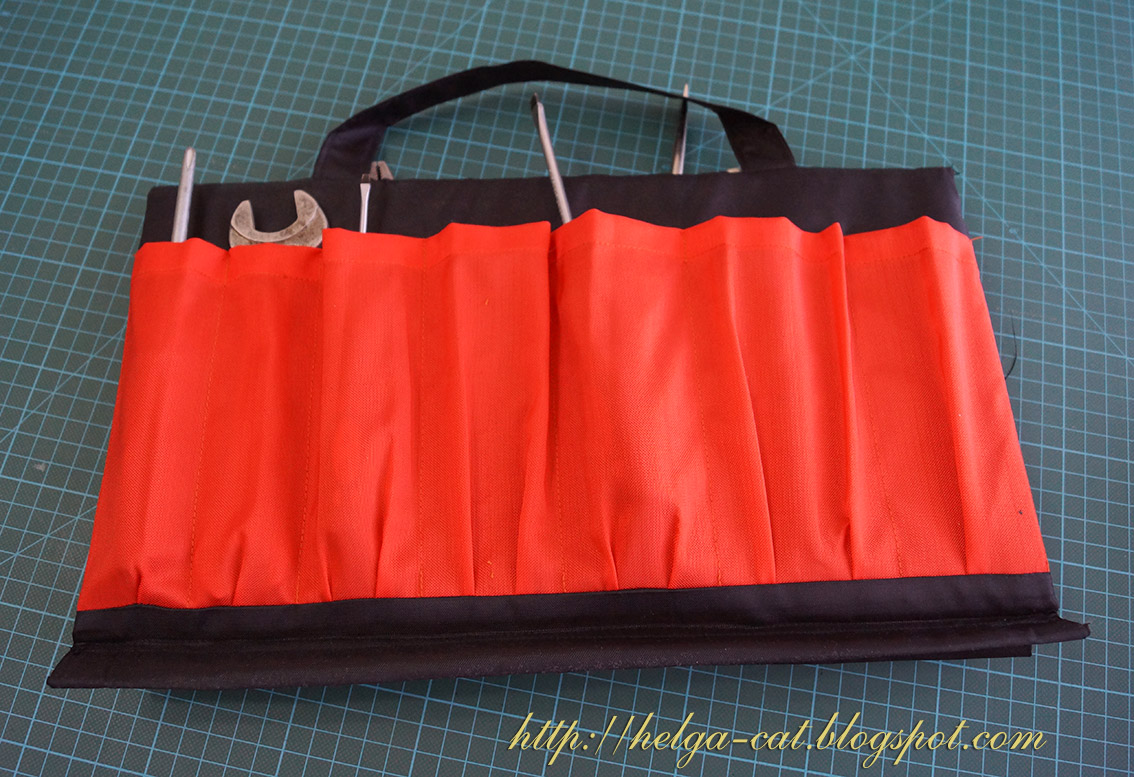 Ну, и ещё одна полезная штука сшитая для любимого мужа по его просьбе. Органайзер для наиболее часто используемых инструментов. Здесь в ход пошёл тот же старый капрон, который я использовала при шитье сумочки для сумок в машину. Внутри для жёсткости конструкции алюминиевые решётки от вентиляторов с каких-то старых вычислительных машин. Органайзер рассчитан на то, чтобы его хранить в сложенном виде и ставить рядом с собой там, где делаются какие-то работы. Вообще-то инструментов в нём напихано намного больше, чем на фото, и держит его Саша в старой сумке для ноутбука. Ему удобно брать её с собой, к примеру, когда мы едем к золовке в деревню — там постоянно нужны какие-то мелкие и не очень ремонтные работы. Дома просто органайзер за собой носит. А вообще, нам очень не хватает ещё одной комнаты под мастерскую и хранение сашиных инструментов, потому что одной такой сумочкой (и даже десятью) обойтись невозможно, инструментов разных у нас очень много. Эх, хочу частный дом с несколькими разными мастерскими...